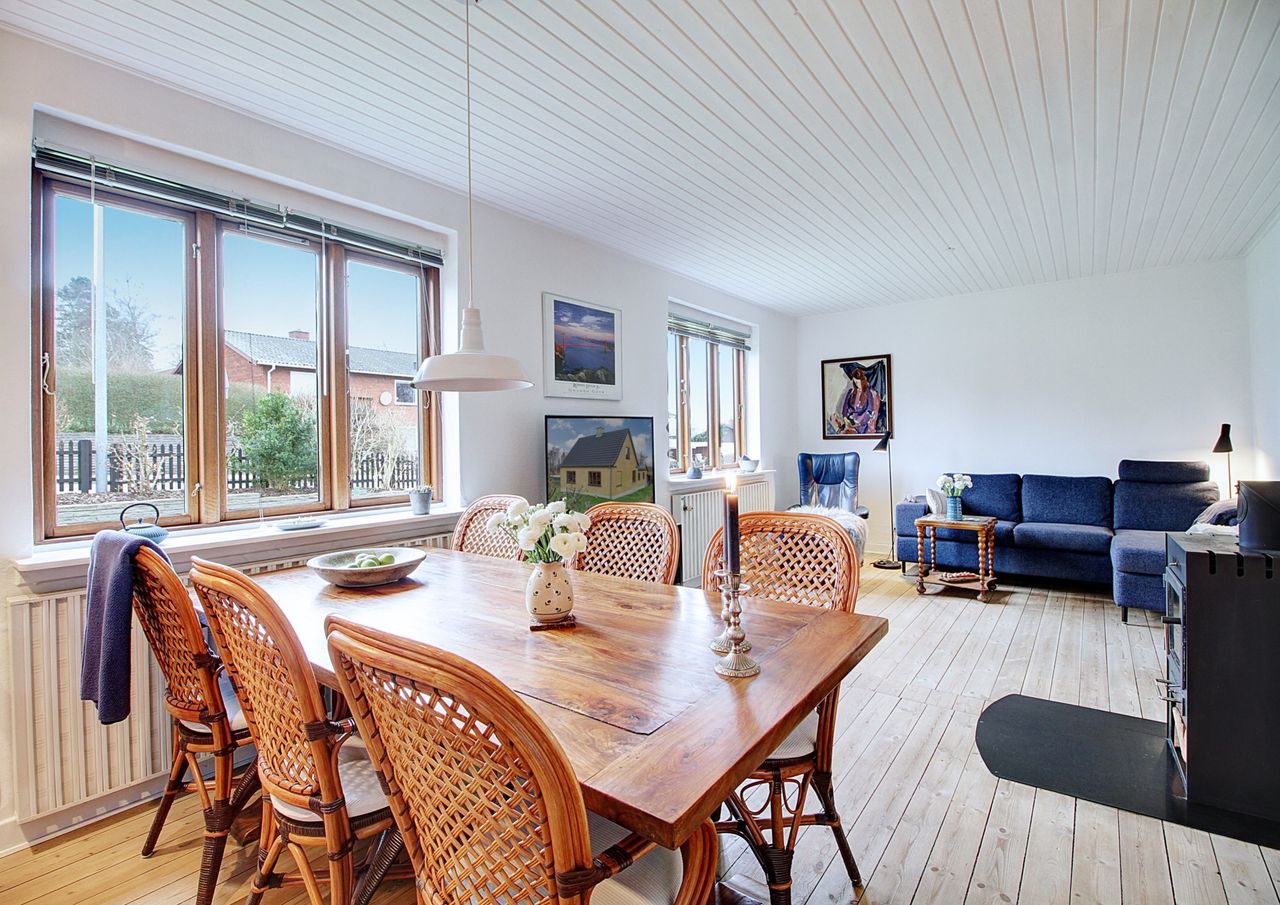 Villaen indeholder dejligt rummeligt og lyst køkken, stor stue med hyggelig brændeovn og god plads til