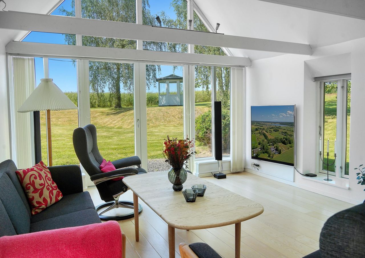 Boligens hjerte er den fantastiske stue med loft til kip og en imponerende glasgavl, som inviterer naturen helt ind i rummet. Her får du udsigt, lys og luft – og på de køligere dage kan du nyde varmen og atmosfæren fra den hyggelige brændeovn.