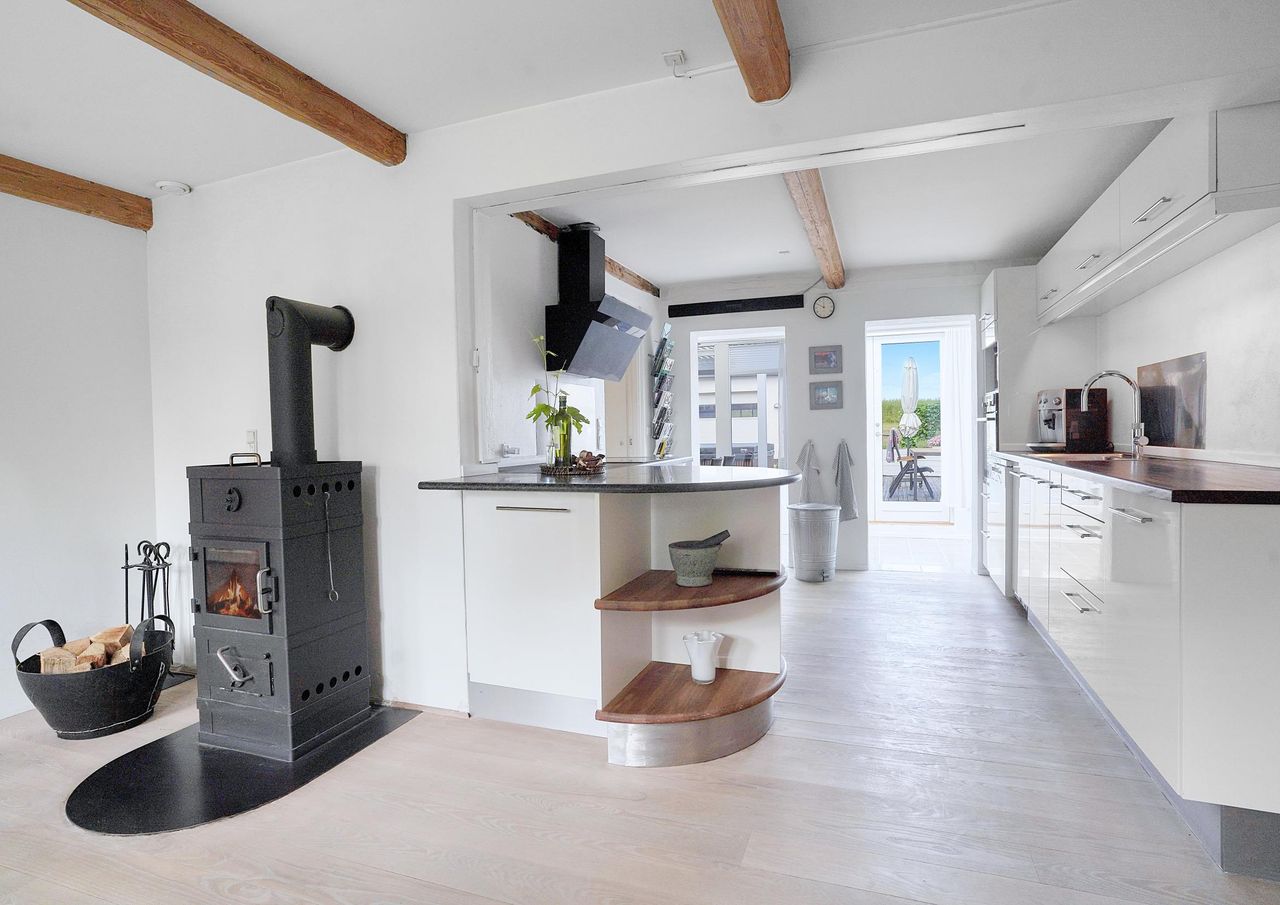 Det charmerende køkkenalrum med endnu en brændeovn er et naturligt samlingspunkt i hjemmet, og herfra er der adgang til et praktisk viktualierum, der skaber plads og overblik.