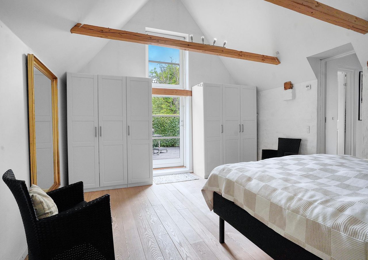 Det rummelige soveværelse har egen udgang til en mindre morgenterrasse, hvor kaffen kan nydes i fred og ro, samt adgang til et lækkert badeværelse – ligeledes med udgang til haven.